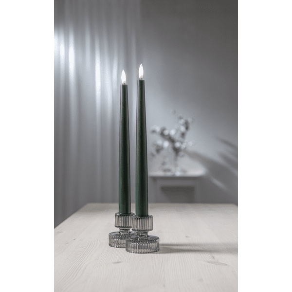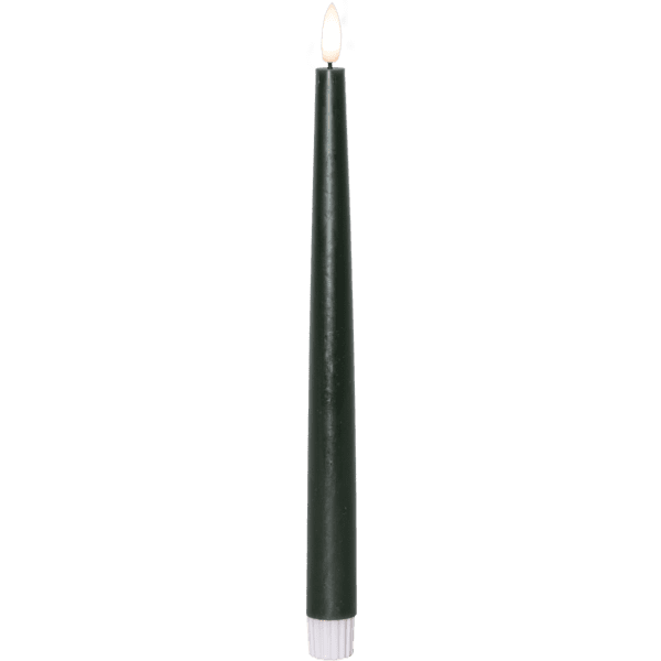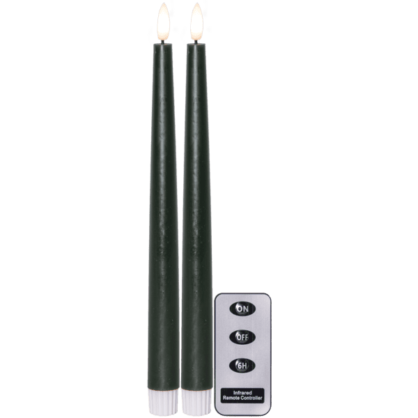 2- pack Antikljus på batteri , med en slät yta och i en vacker mörk grön färg. Går på timer, 6h på och 18h av.  Höjd: 28cm Ger en fin naturtrogen låga. Fjärrkontroll ingår. Max 10 ljus går att styra med samma kontroll.